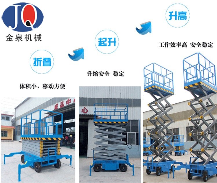 金泉機械引進先進流水線生產工藝流程,機器人焊接,全數控切割,高精度鋼板折彎,批量定做特殊材質型材,拋丸烤漆處理,無損批量組裝!自行剪叉升降機、自行曲臂升降機等高端升降機械近期量產!金泉機械用高端工藝打造精品升降機械,售低端價格、創造升降機行業新起點!經銷商火熱招商中!金泉機械,只做精品!