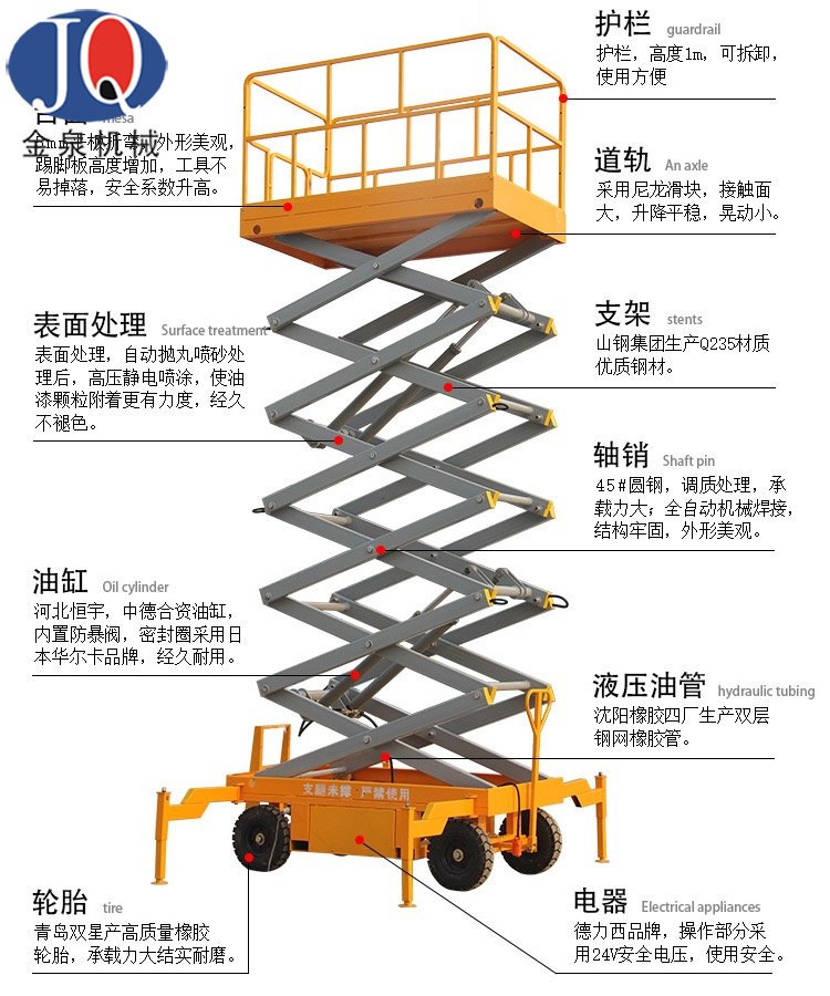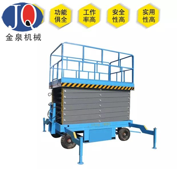 新型移動剪叉升降機主要技術特點:臺面鋼板折彎、底架及剪叉結構山鋼定做高強度矩形管材; 標準冷彎槽做道軌,使用尼龍滑塊做導軌輪,接 觸面大,升降平穩,晃動小;液壓油缸  內置防爆閥(防止油管斷裂,平臺失速下降),采用進口密封圈,經 久耐用,不泄露;雙層鋼網高壓油管; 升降作業平臺專用液壓泵站,加裝應急下降閥,平臺斷電可手動控制 下降,內置溢流閥,可防止上行運動時系統壓力過高,起到超載保護功能;充氣橡膠輪胎; 電路電器、接觸 器羅列連接,加裝熱過載保護,缺相保護等安全保護功能;電動上、下電動控制,控制按鈕盒加裝急停按鈕, 以最大限度保障財產及人身安全,各操作部分使用24V安全控制電壓;軸銷圓鋼配做,調質處理;拋丸、噴砂 除銹處理,除去鋼結構構件表面的銹蝕及焊接飛濺,能使鋼構件表面產生一定程度的凹凸不平的效果,增大粉 末的附著力;使用靜電粉末噴涂;涂層外觀質量優異,附著力及機械強度強,色澤亮度高,經久不褪色。